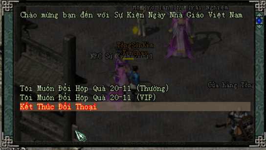Hộp Quà Đạc Biệt | Nguồn gốc: Ghép tại NPC 20-11 Công thức: 5 Chữ Tôn + 5 Chữ Sư+ 5 Chữ Trọng + 5 Chữ Đạo+ 5 Tiền Đồng Tính chất: Xếp chồng 250/250, có thể giao dịch Phần thưởng: (Giới hạn 1000 vật phẩm/nhân vật) - Exp Nhân vật x 15000